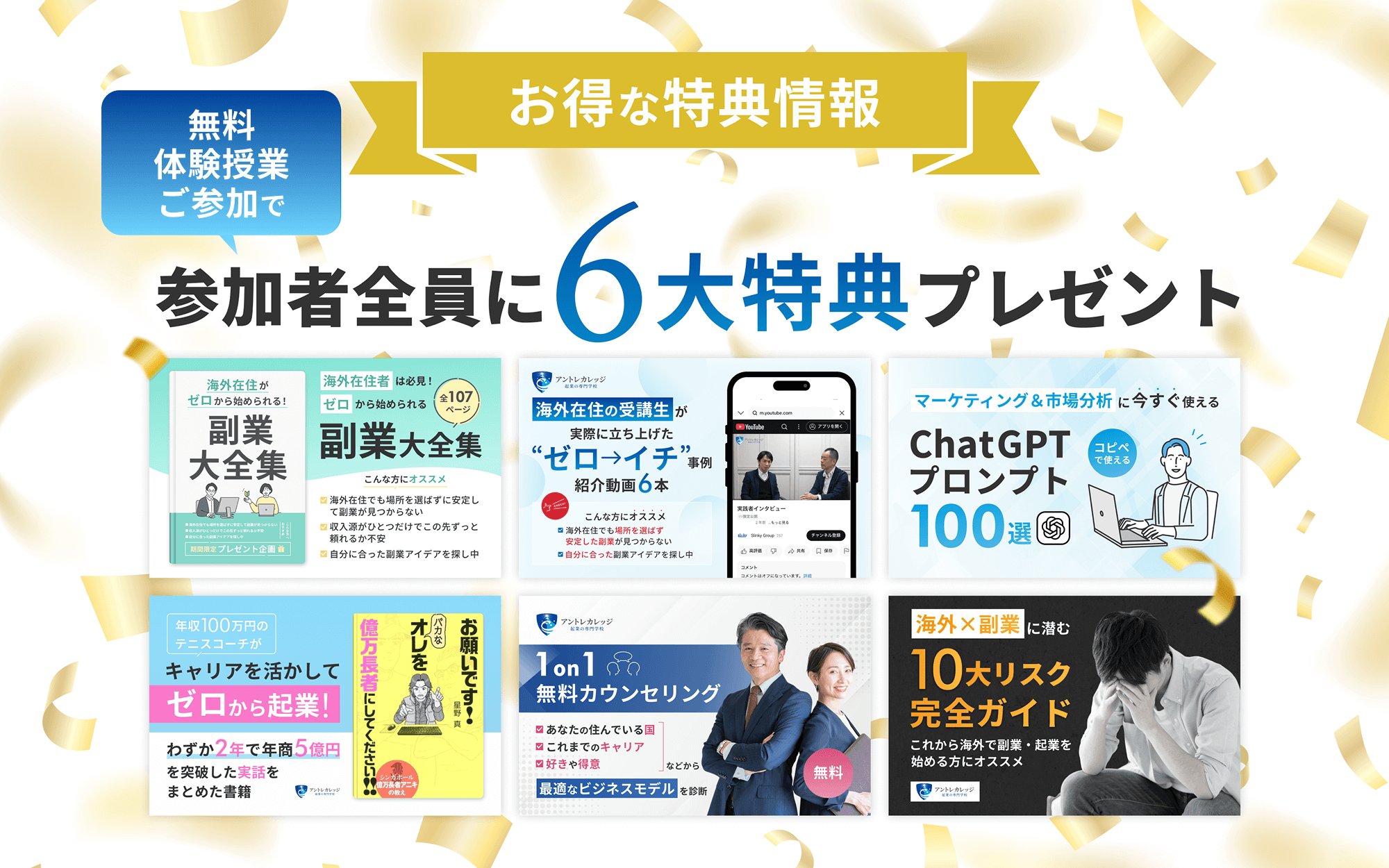 本業の収入だけに頼っているので副収入づくりが不安です。リスクを抑えて始められますか?まずは無料体験授業にご参加ください。33か国以上での実例をもとに海外在住者がビジネスを立ち上げるポイントを解説します。
